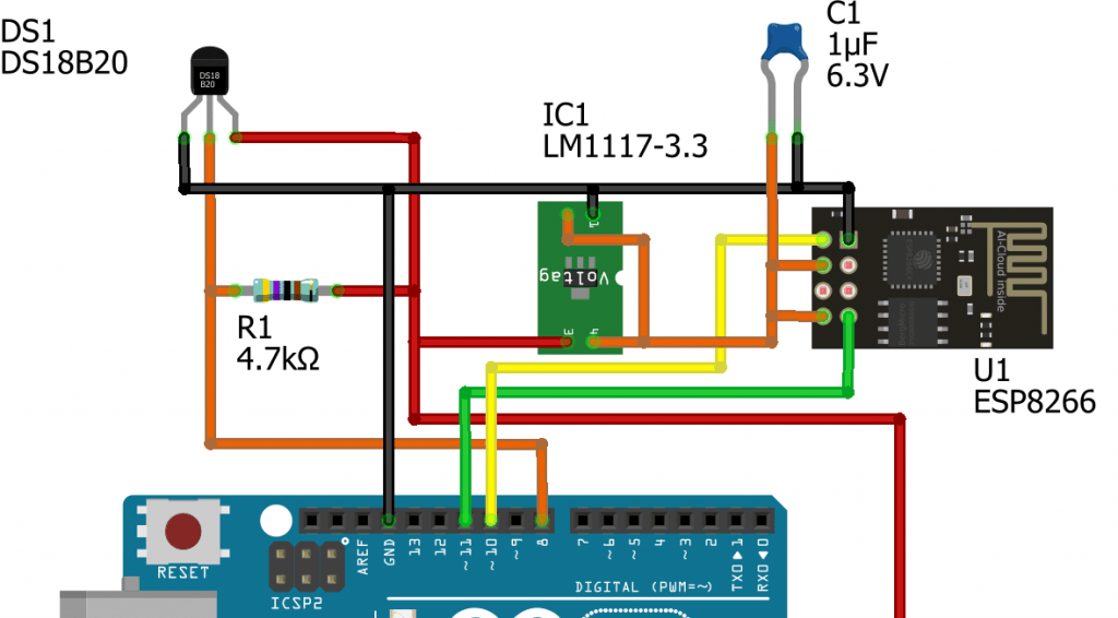 First we need to connect everything together as on the following Fritzing diagram: