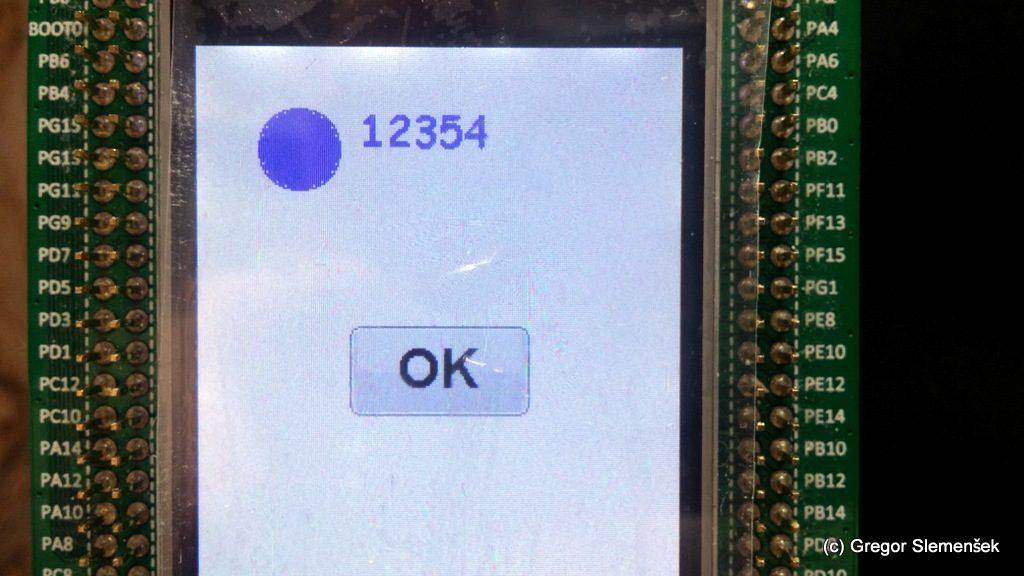 GUI_Init(); GUI_SetBkColor(GUI_WHITE); GUI_SetColor(GUI_BLUE); GUI_Clear(); GUI_DrawCircle(50, 50, 20); GUI_SetColor(GUI_ORANGE); GUI_FillCircle(50,50,19); HAL_Delay(2000); b1 = BUTTON_CreateEx((LCD_GetXSize() / 2) - 45,(LCD_GetYSize() / 2) - 22,90,45,0,WM_CF_SHOW,0,0); BUTTON_SetText(b1, "OK"); BUTTON_SetFont(b1, GUI_FONT_32B_ASCII); GUI_Exec(); HAL_Delay(2000); GUI_SetColor(GUI_BLUE); GUI_FillCircle(50,50,19); GUI_SetFont(GUI_FONT_COMIC24B_ASCII); GUI_DispDecAt(12354, 80, 30, 5); /* Infinite loop */ /* USER CODE BEGIN WHILE */ |